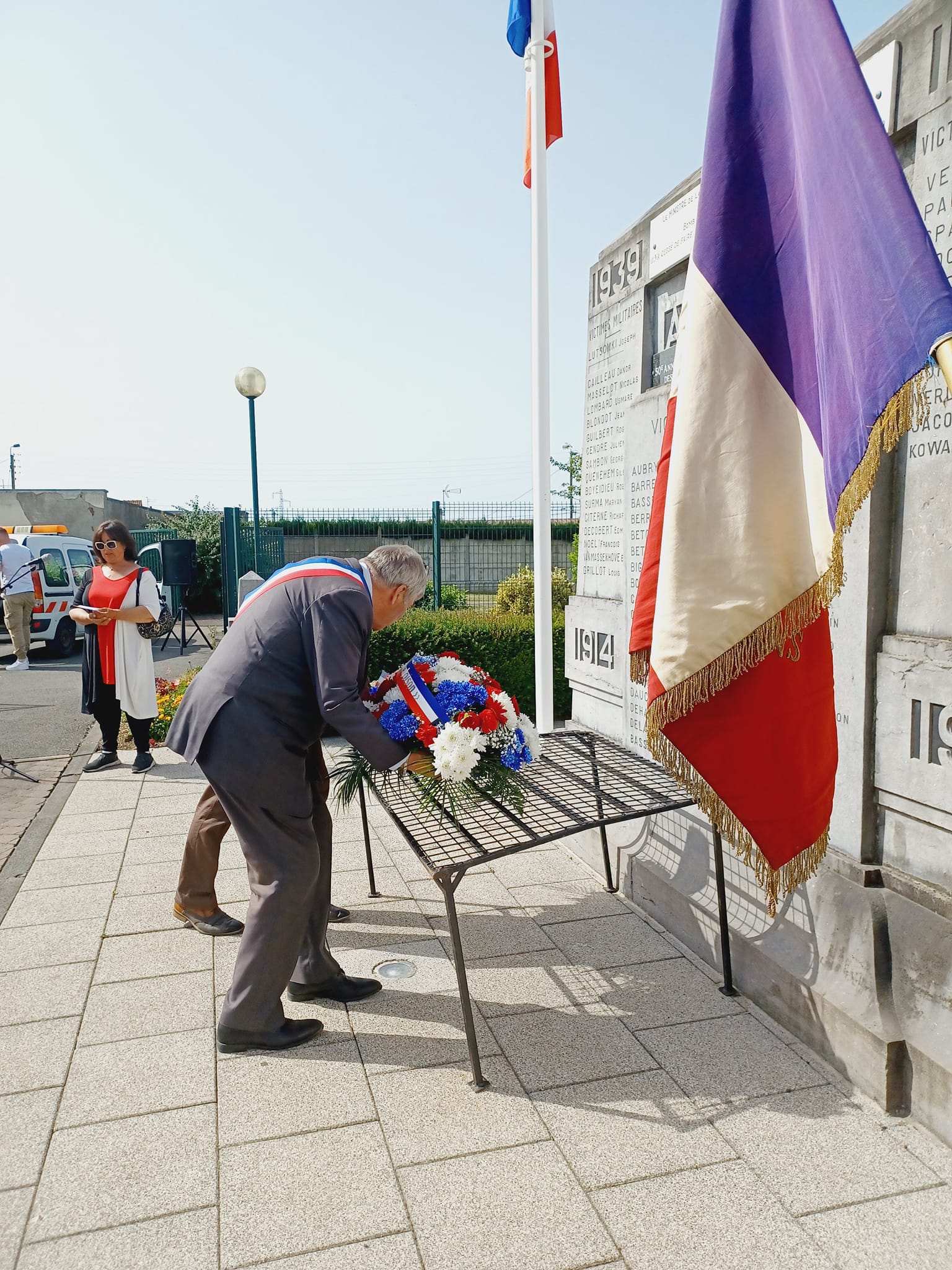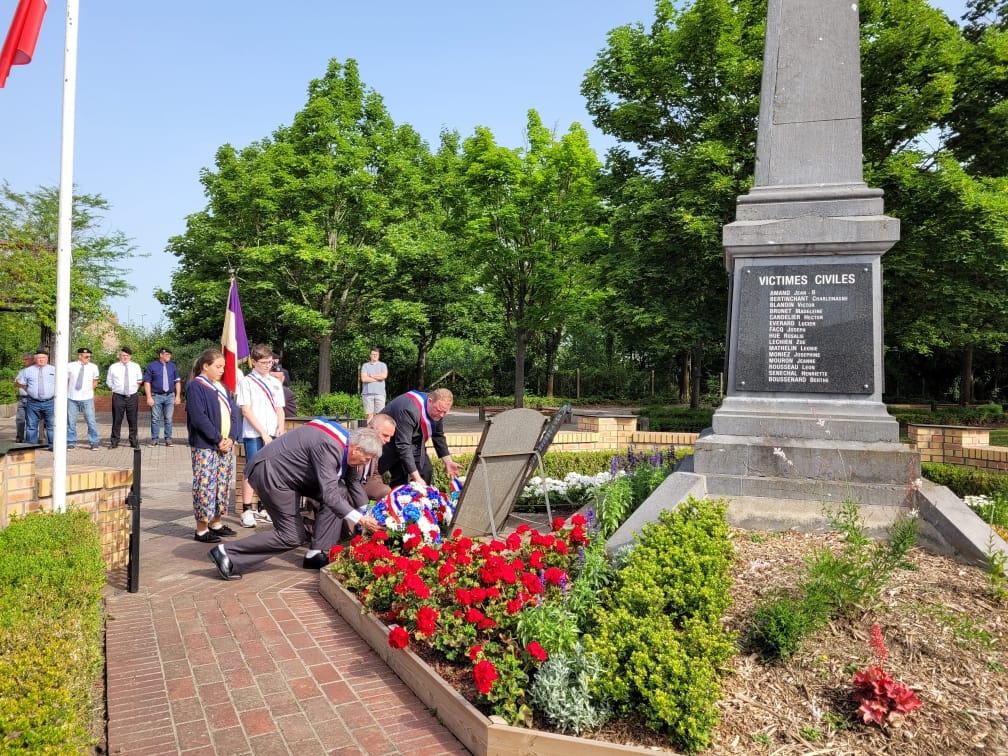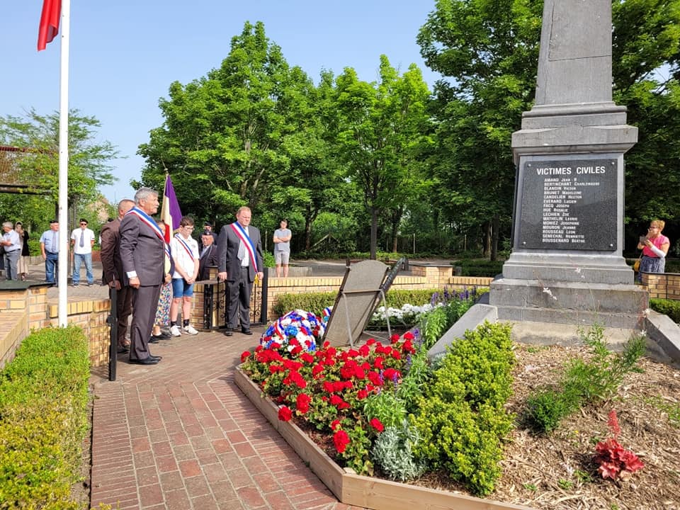 Puis Monsieur le Maire et M. Alain Kucharski, membre des ACVG, ont déposé deux gerbes de fleurs au pied du monument de la rue L. Blum. Monsieur le Maire a prononcé quelques mots pour ne pas oublier cet acte fédérateur depuis l’Angleterre face à l’occupation allemande de notre pays.