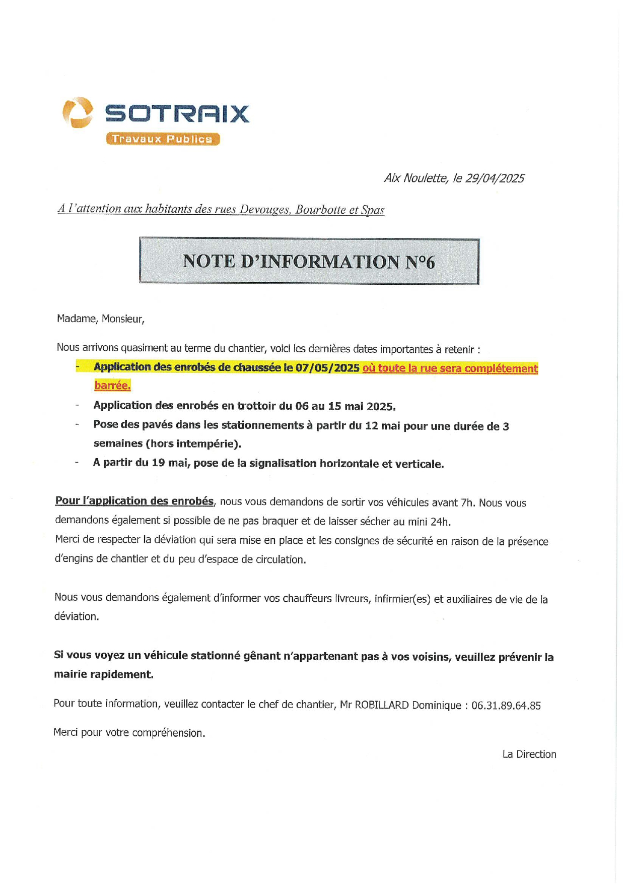 Pour toutes informations, vous pouvez contacter le chef de chantier au 06 31 89 64 85.