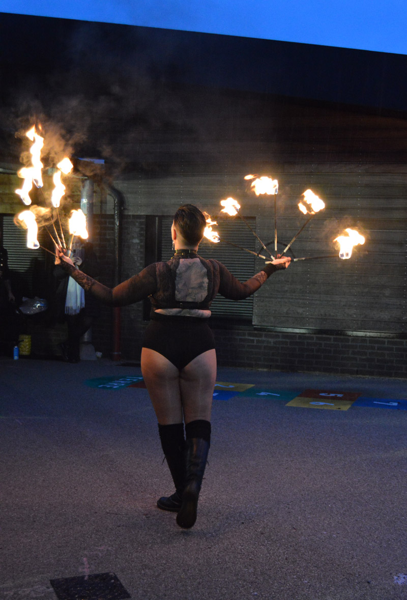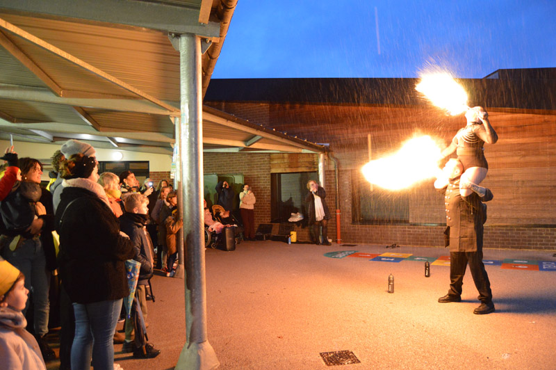 Puis la compagnie VadeRetro a présenté un spectacle de cracheurs de feu dans la cour de l’école L. Ventura. Malgré la pluie, les différentes figures ont subjugué le public, petits et grands en ont pris plein les yeux.
