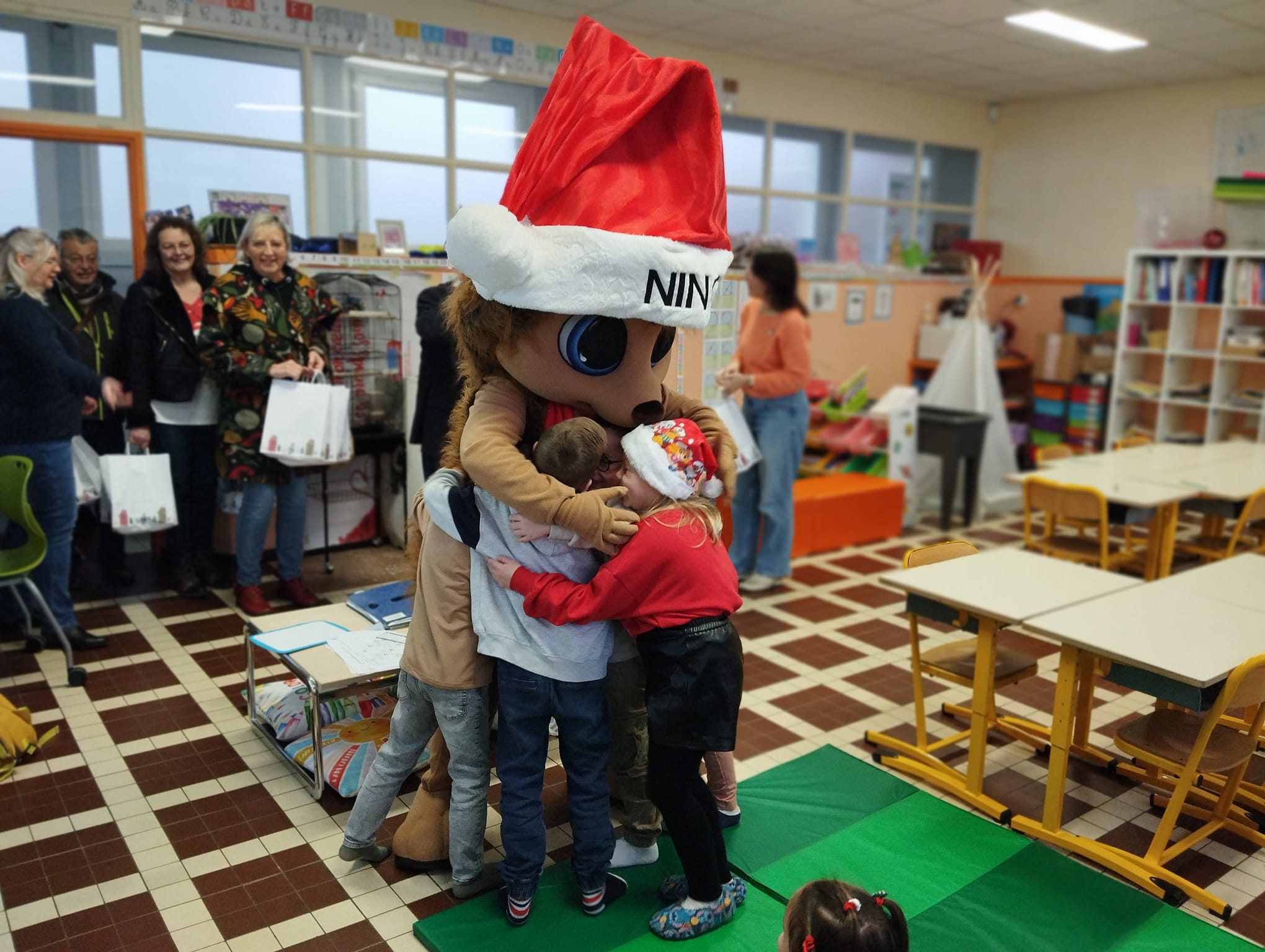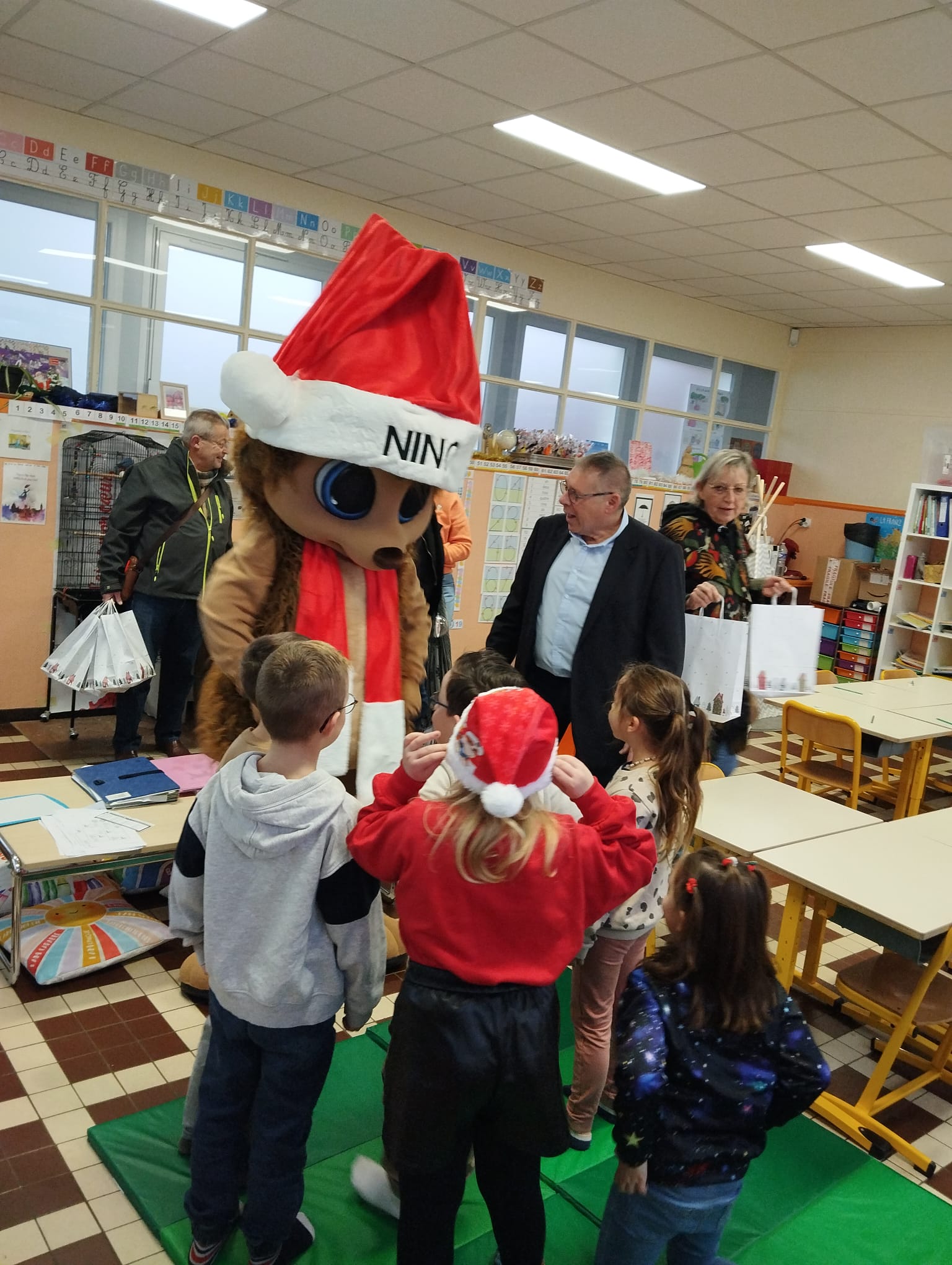 Le lendemain, Père Noël accompagné de notre mascotte Nino et d'une délégation d'élus municipaux, sont venus à la rencontre des écoliers pour leur remettre des chocolats de noël. Joie, bonne humeur et sourire étaient au rendez-vous !