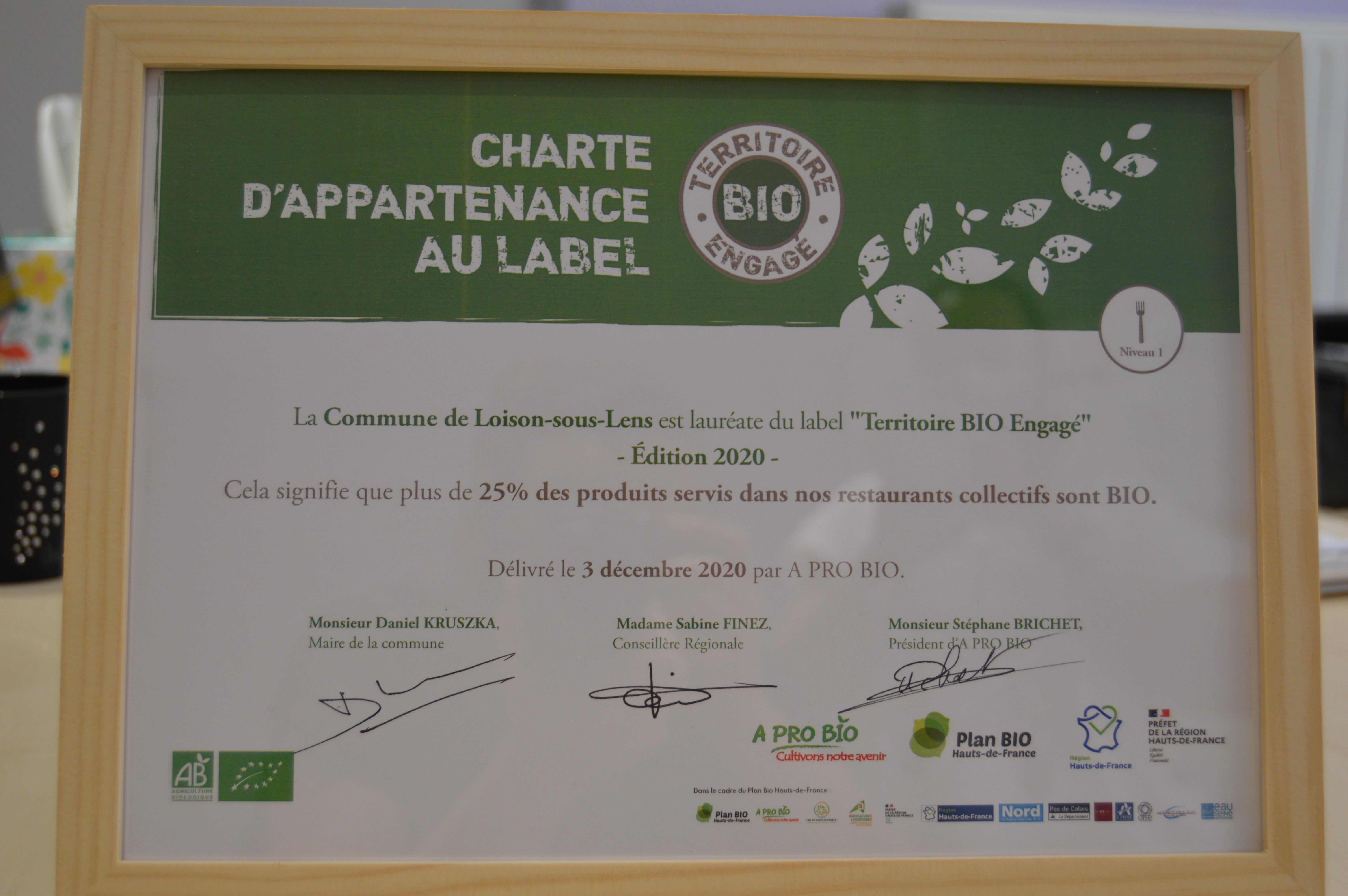 Monsieur le Maire, Madame Sabine Finez, Conseillère Régionale, et Monsieur Stéphane Brichet, président d’A Pro Bio, ont ainsi signé conjointement un diplôme récompensant l’engagement de la Municipalité pour une agriculture durable et responsable tout en sensibilisant la jeunesse. Commune pilote du projet SATD (Système Alimentaire Territorial Durable) de la Communauté d’Agglomération de Lens-Liévin, Loison-sous-Lens est souvent prise comme exemple par les autres villes du territoire.