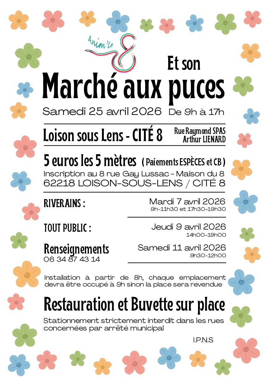 L'association Anim' le 8 organise un marché aux puces le samedi 25 avril 2026 de 9h à 17h dans la cité 8 : rues R. Spas et A. Liénard.